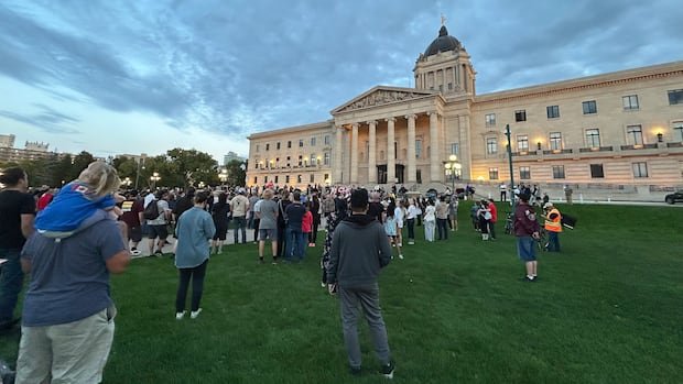 A large crowd gathered at the Manitoba Legislative Building on Tuesday evening to pay tribute to Charlie Kirk, referring to him as a martyr. Kirk, a 31-year-old American conservative activist, was shot during a speaking engagement at a university in Utah on Sept. 10.